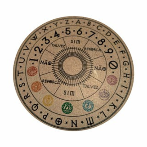 O tabuleiro apresenta letras, números, símbolos dos chakras e expressões como "sim", "não" e "talvez", facilitando a formulação de perguntas e respostas. No centro, você encontrará um gráfico radiestésico projetado para a limpeza de energias sutis. Esse gráfico ajuda a desimpregnar cristais e outros objetos que possam estar carregados após sessões de cura e harmonização.