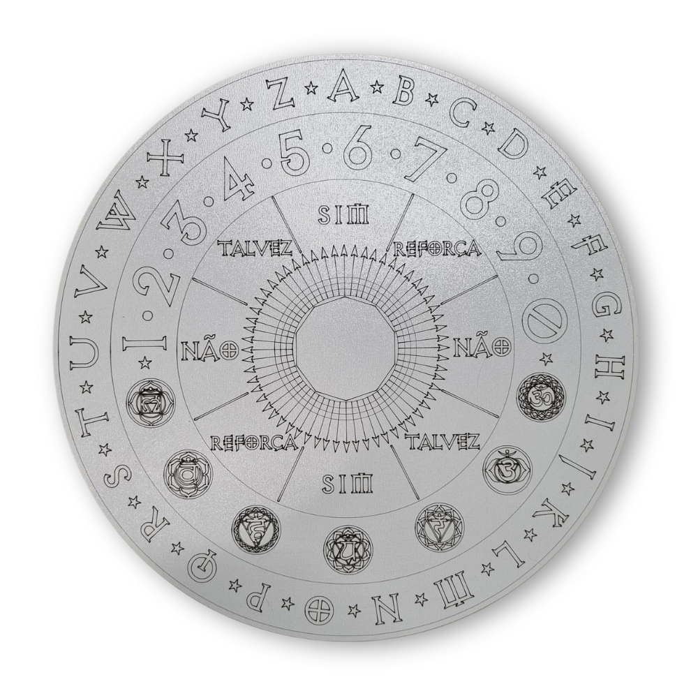 O tabuleiro apresenta letras, números, símbolos dos chakras e expressões como "sim", "não" e "talvez", facilitando a formulação de perguntas e respostas. No centro, você encontrará um gráfico radiestésico projetado para a limpeza de energias sutis. Esse gráfico ajuda a desimpregnar cristais e outros objetos que possam estar carregados após sessões de cura e harmonização.